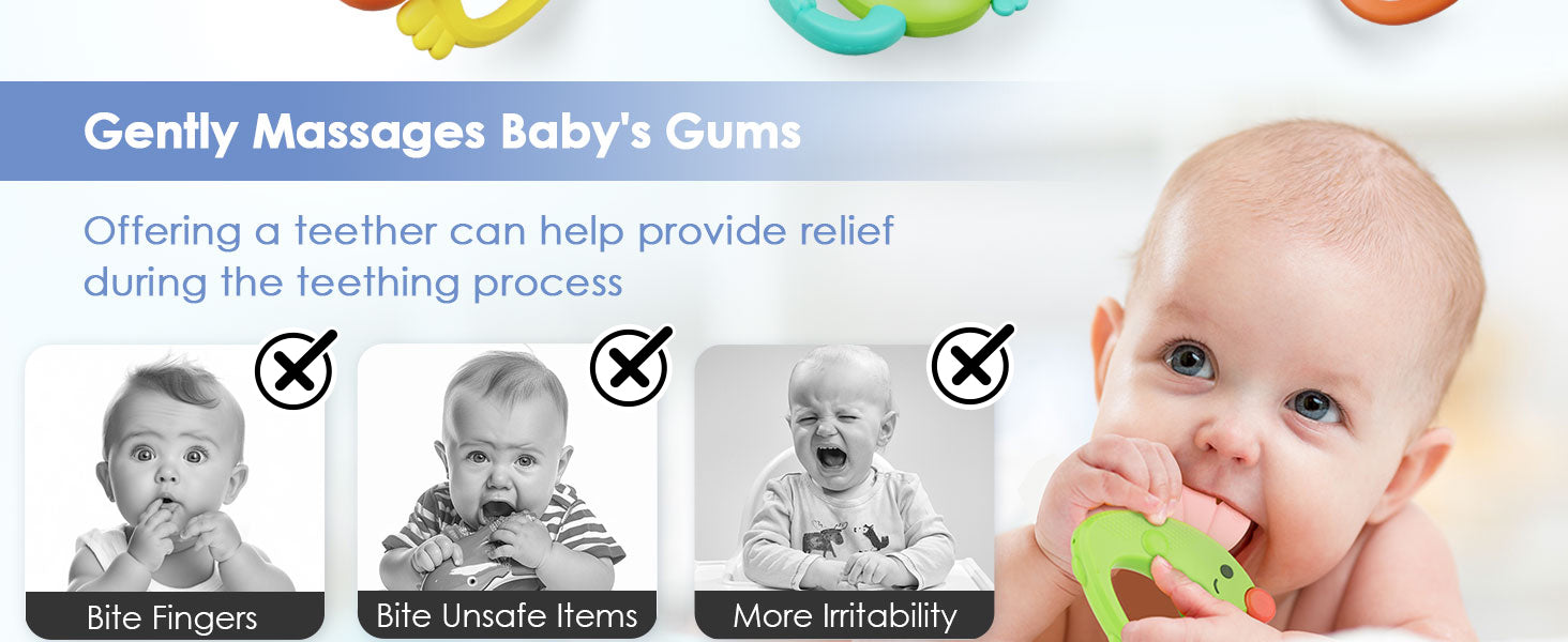 • Baby Teether: Textured design baby teether helps relieve teething pain caused by the growth of lateral incisors and molar teeth