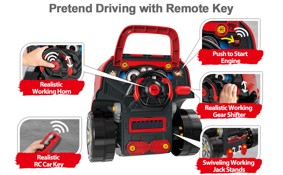 - 【Fun Car Features】Simulate real driving, push to start engine, turn on hazard lights, automatic gear shifter, steering wheel with working horn, jack stands to raise vehicle, removable wheels and rims, handle to push/pull engine around. Also includes storage for parts and tools.