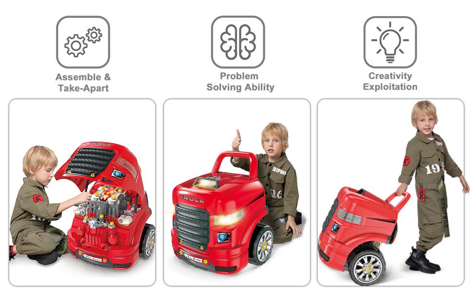 - 【Imaginative Play-To be a Little Mechanic】Full of hands-on engine parts to work on! Like working LED headlights, engine w/ light & sound. Open the engine cover, you can removeable engine parts, use the oil dipstick to check the oil, take apart and rebuild engine. Take apart or assemble as you want.