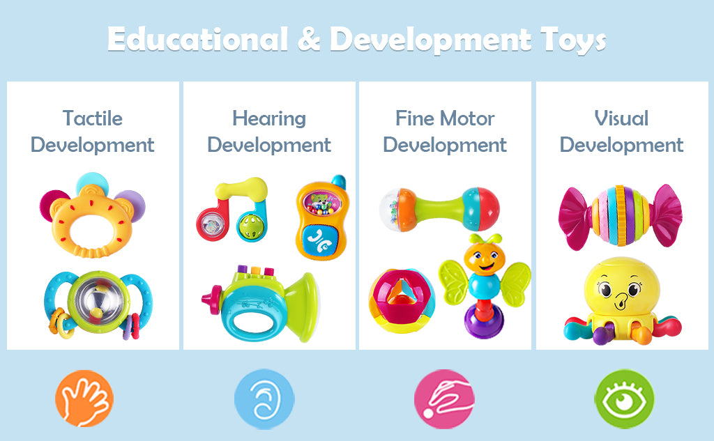 - Variety of textures will assist in tactile development of touch, taste and smell. Numerous sounds will expand babies’ sensory experiences, colors and patterns help eye tracking skills.