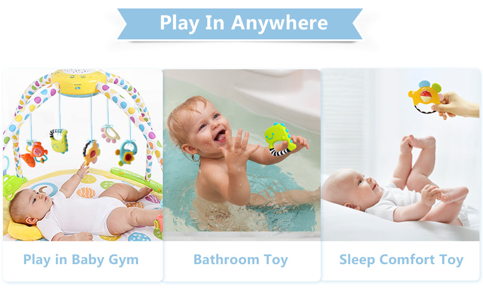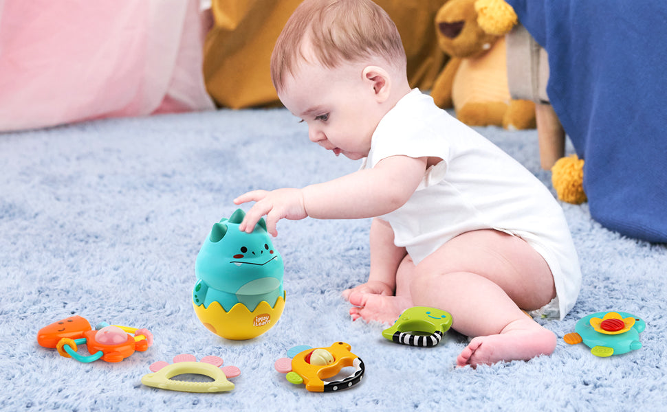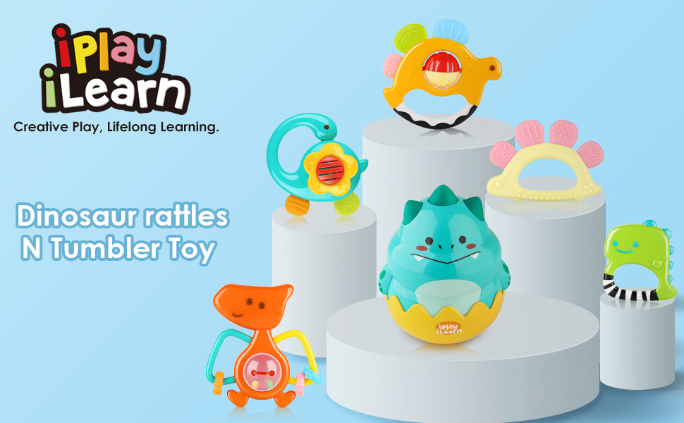 - Tummy Time Toys: 5 Pcs Bright Primary colored Rattles/Teethers for different stages of baby’s development. This funny dinosaur egg is also a roly-poly toy that a child can bat at without it rolling away.