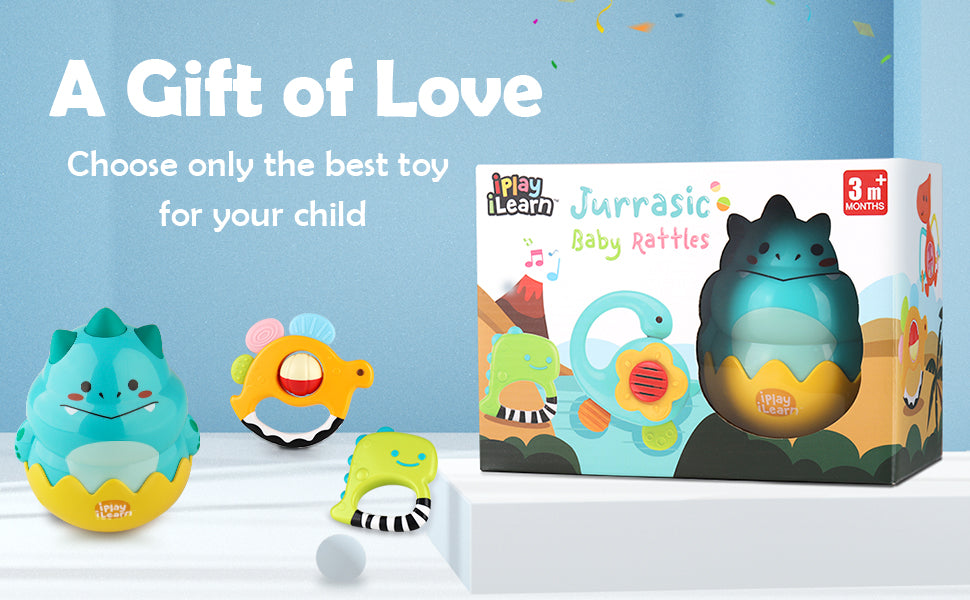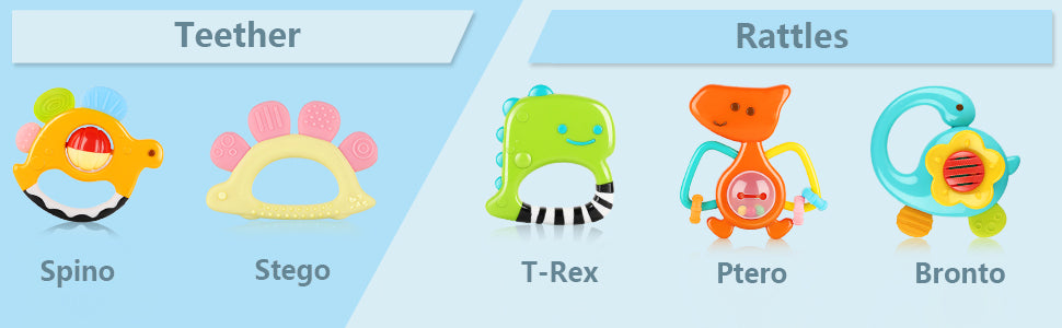 - Cute Shape and Bright Colors: Each rattle corresponds to a dinosaur shape, bright colors stimulate the baby's vision.