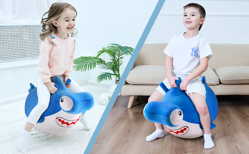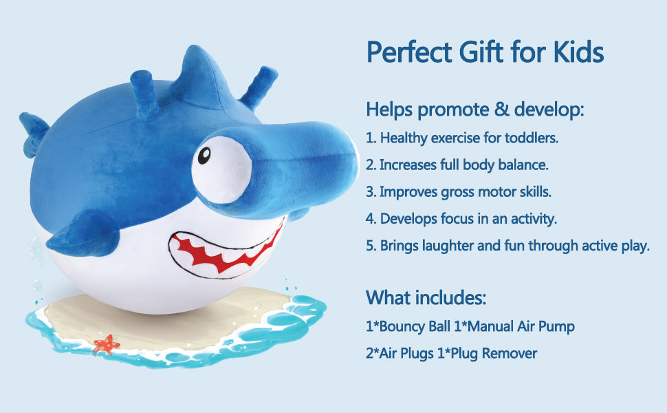 - Hammerhead Shark Design: The hammerhead shark designed hopping ball is covered by soft plush cloth and the inside is eco-friendly rubber. Will attract your kids eyes and heart at the first glance!