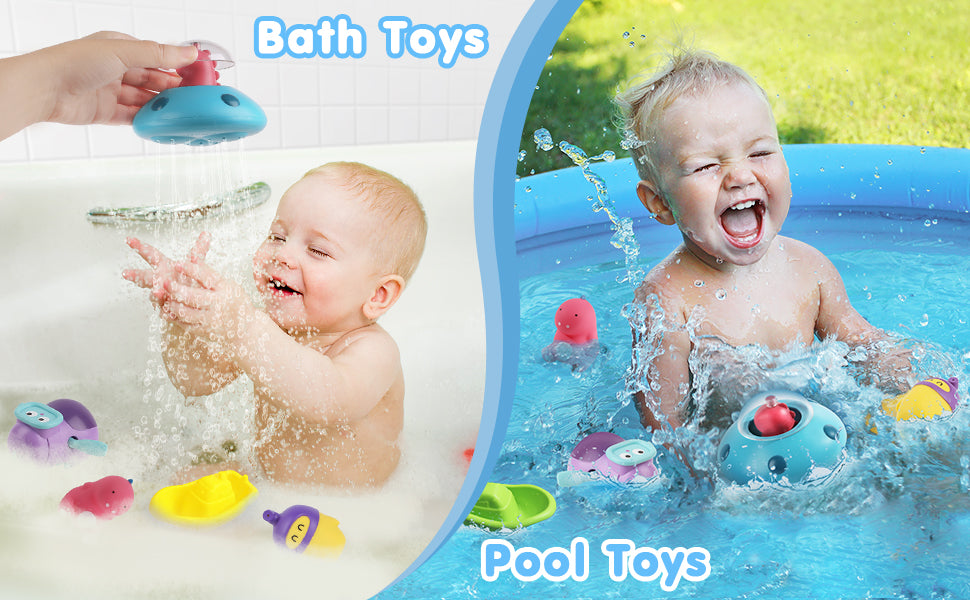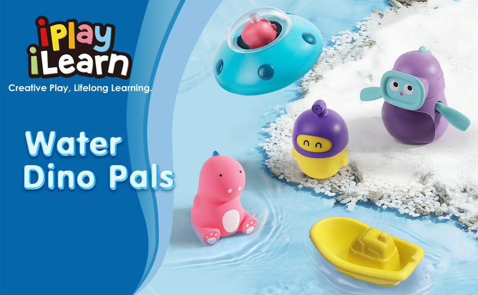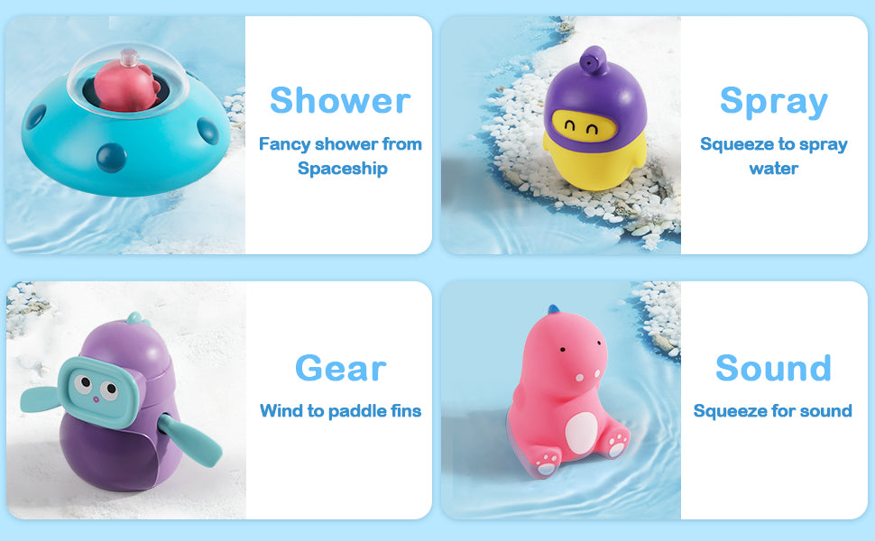 - Fun Bath Time - Dino bathtub toy set includes cute wind up swimming dino, spaceship sprayer, floating squeaky dino, water squirting toys and stackable boats.