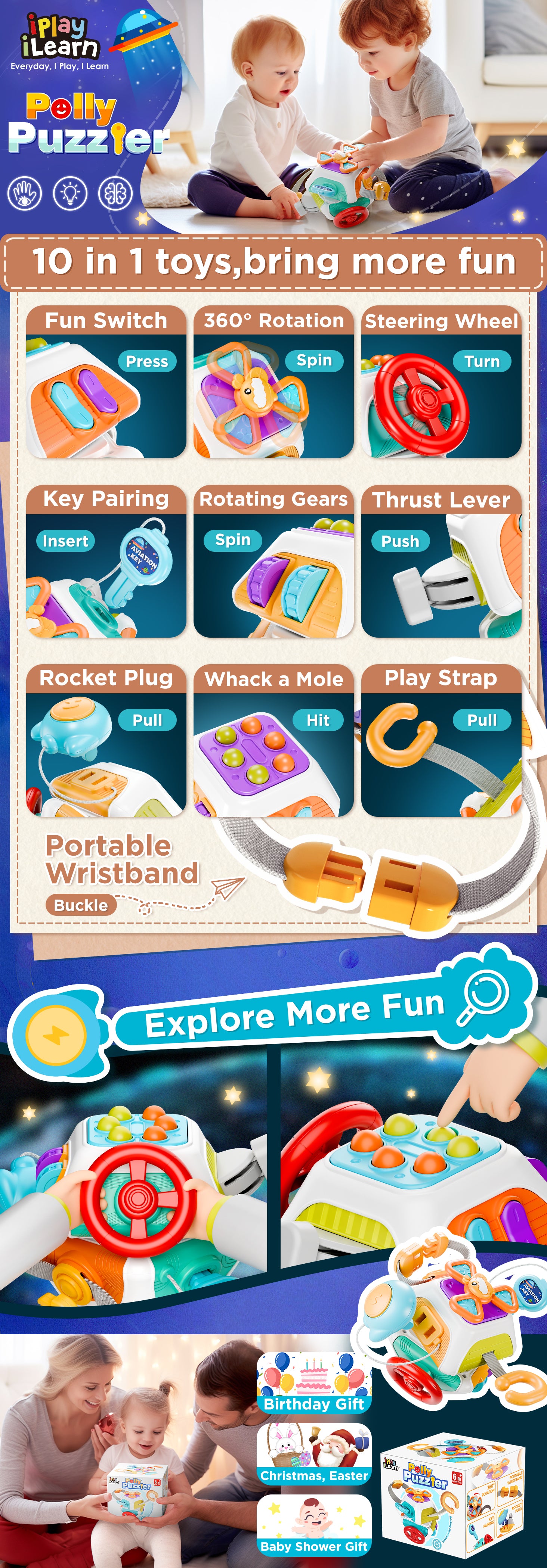 - [ 10 in 1 Montessori Toys] This Montessori toys includes 10 activity panels that offer different experiences. Such as spinner toy, whack a mole, steering wheel, Rocket Plug, Key Pairing, fun switch and so on. These are awesome montessori toys for 6 month+ as they keep infant busy and entertained for hours, fostering their creativity and imagination.