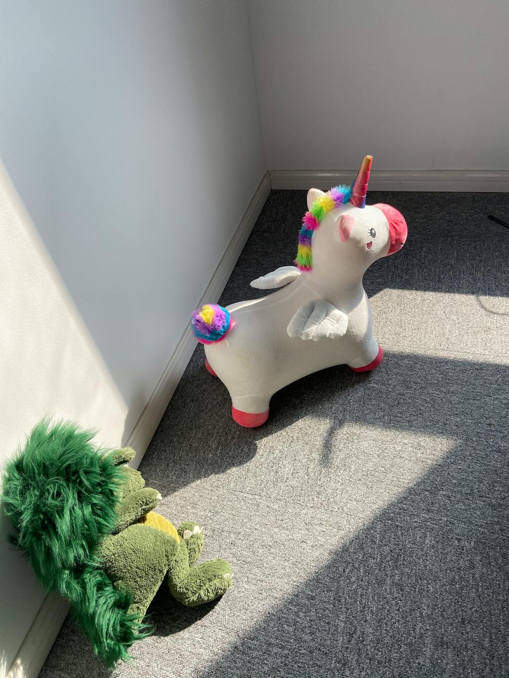 Bouncy Unicorn sports a white coat and fluffy rainbow mane and tail made from ultra-soft plush fabric. Plush cover can be unzipped to remove and is machine washable. With a stable 4-legged design, two wings, and a magical horn for grasping, this colorful Bouncy Pal is sure to brighten and delight!