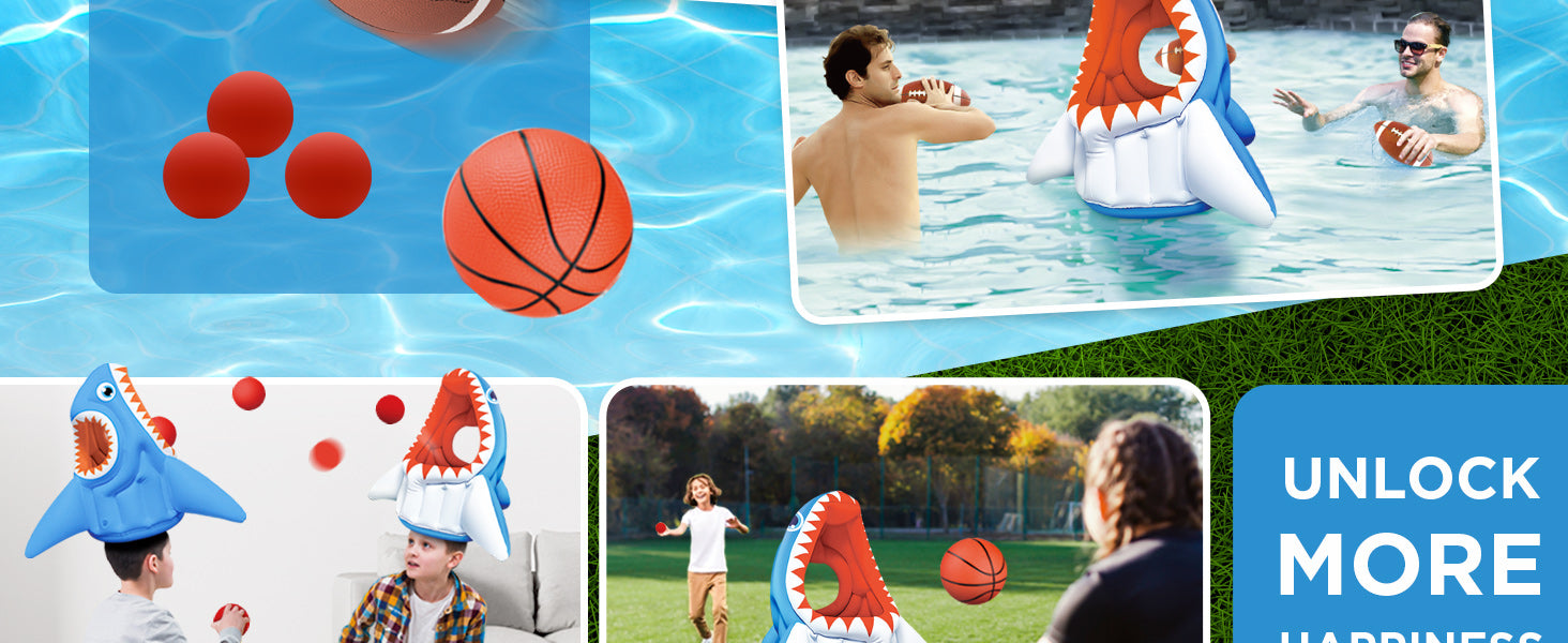 Kids Shark Pool Toys, inflatable Float Basketball Football Head Hoop Toss Water Game