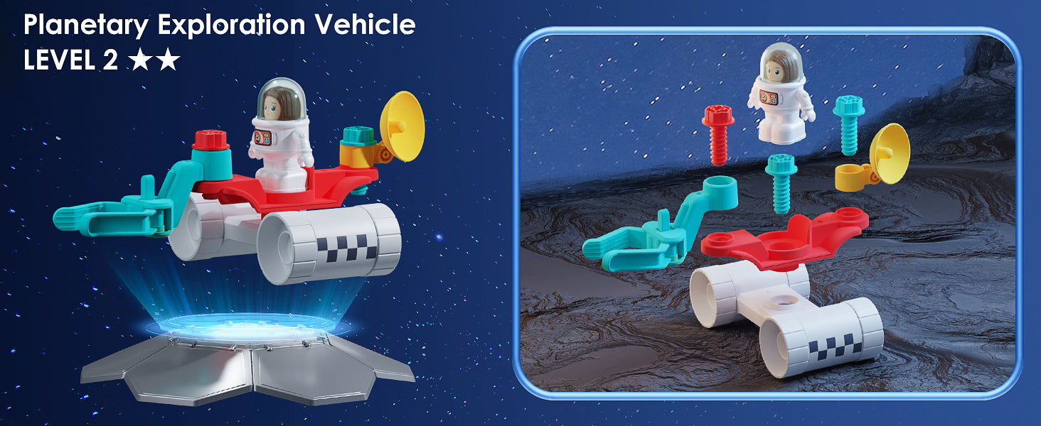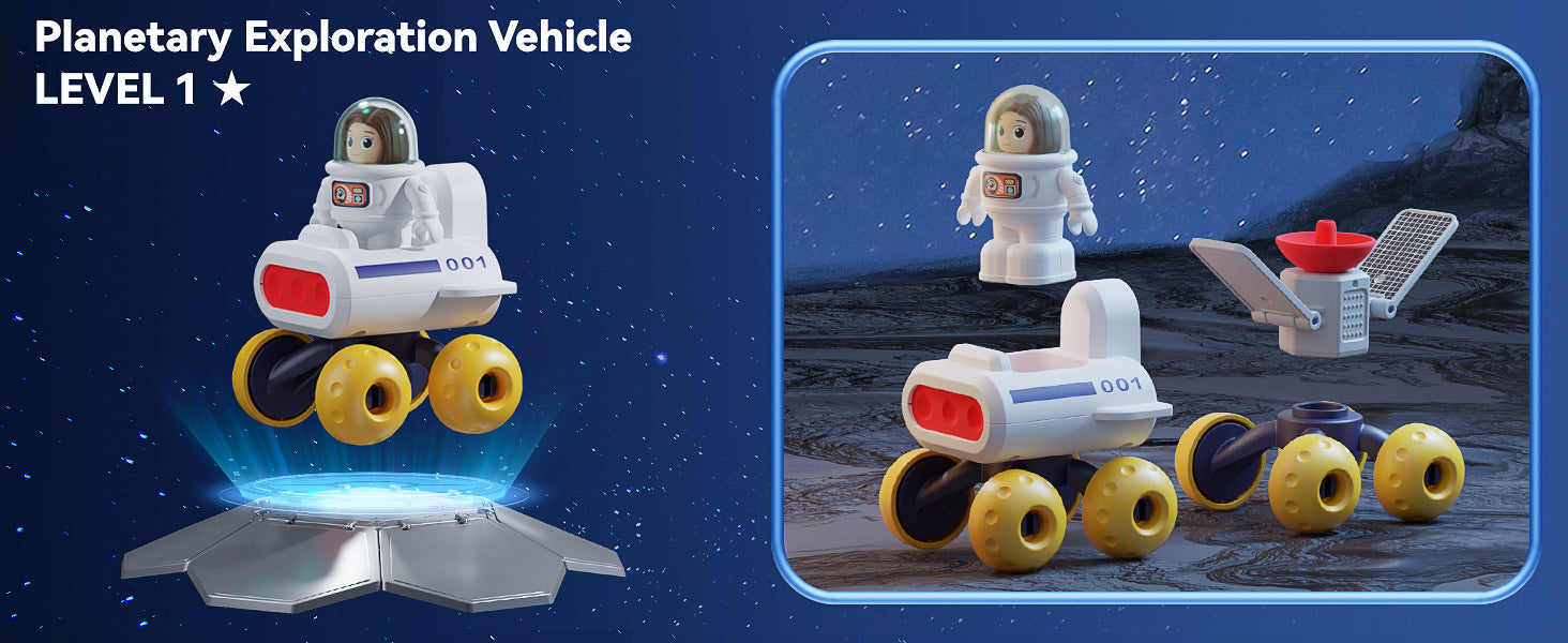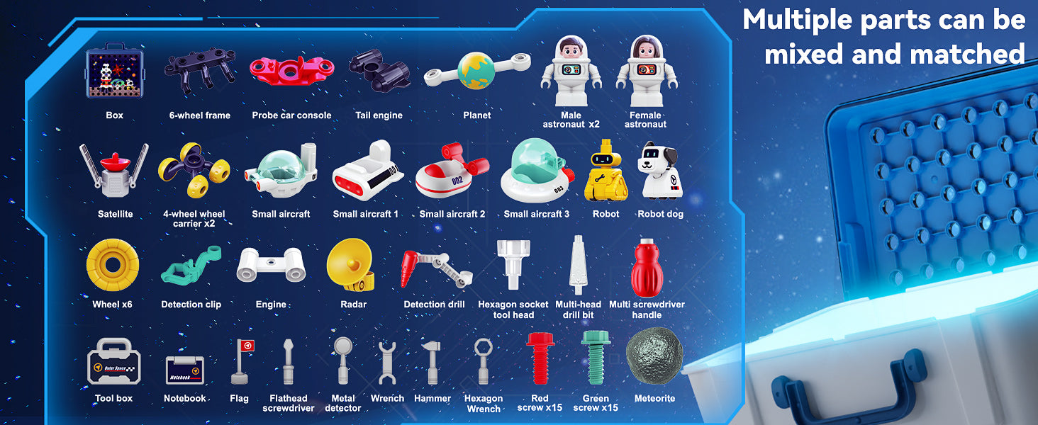 - 【Lunar Adventure Kit】The space toys include multiple space shuttles, spaceships, planetary rovers, aircraft, astronauts, robots, and a toolbox. Let's explore the mysteries of space science and the universe with your children.