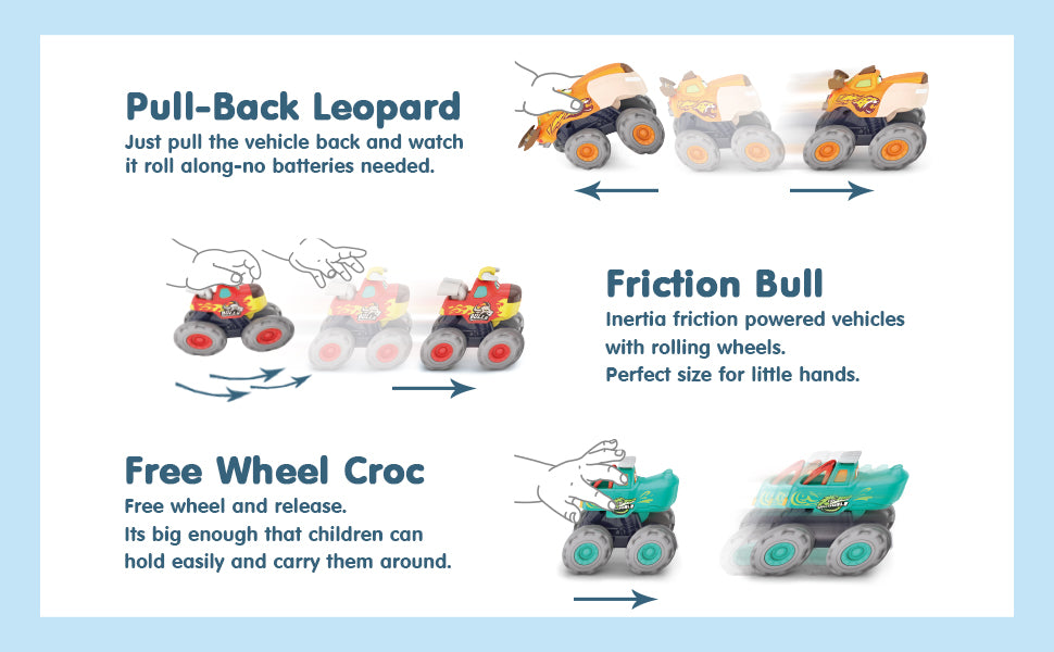 - Pull Back & Go Lightning Leopard - Pull it back, and let it run wild! Its mouth opens and closes as you push the button on the top of the car, just like a real animal monster truck!