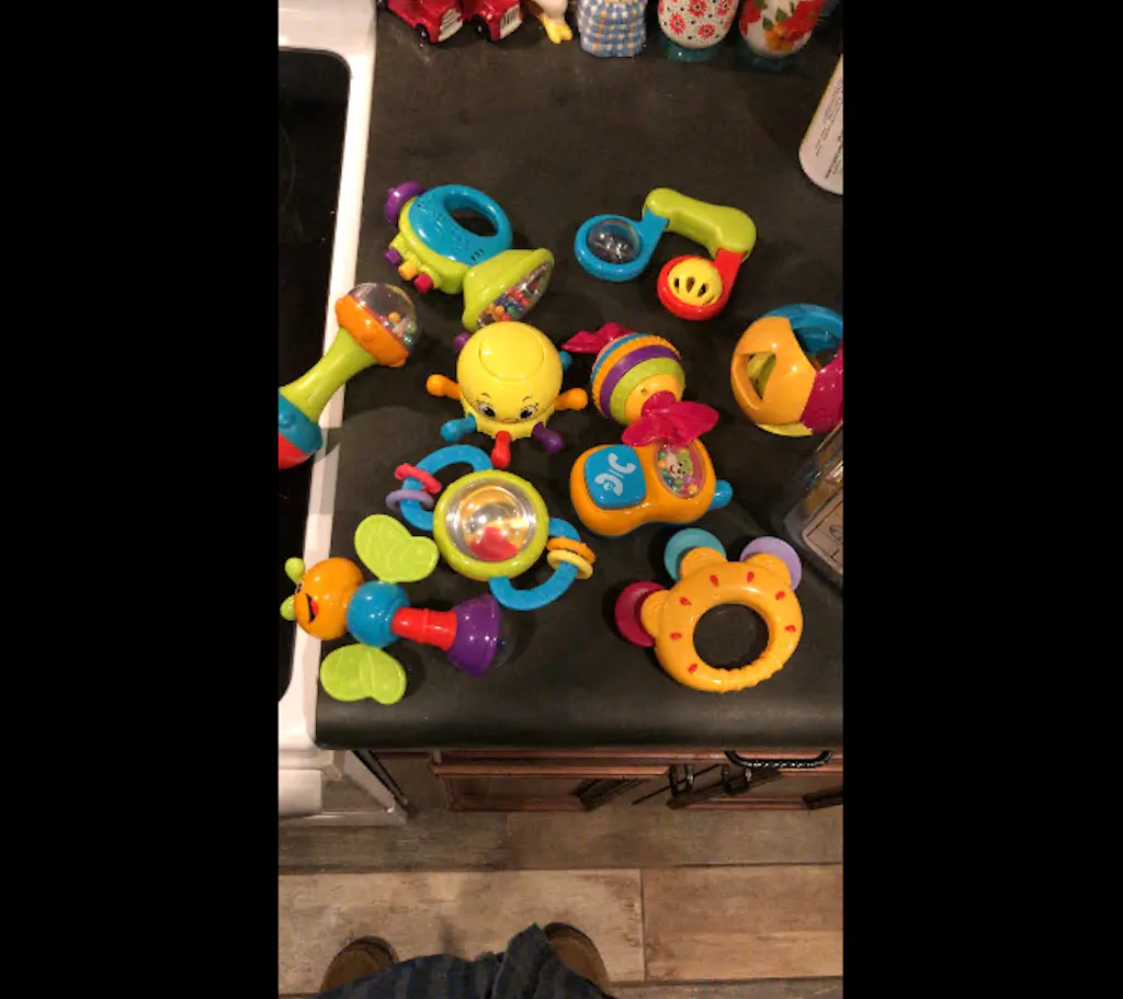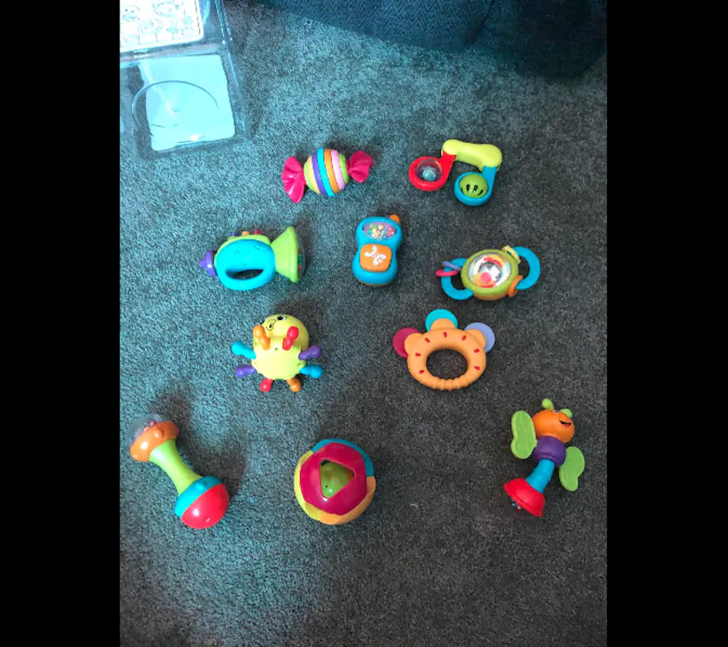 - 10 Bright Primary colored Rattles/Teethers for different stages of baby’s development.