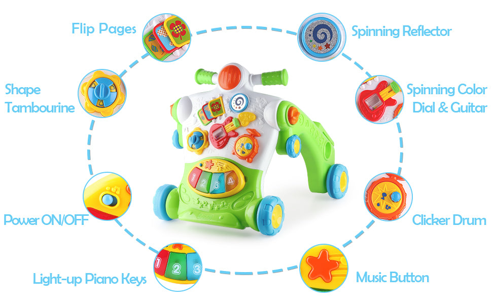 - Sit to Play(6M-9M): Activity Game Board with music and soft lights to stimulate motor skills and intelligence. Detachable piano panel in the front for endless fun