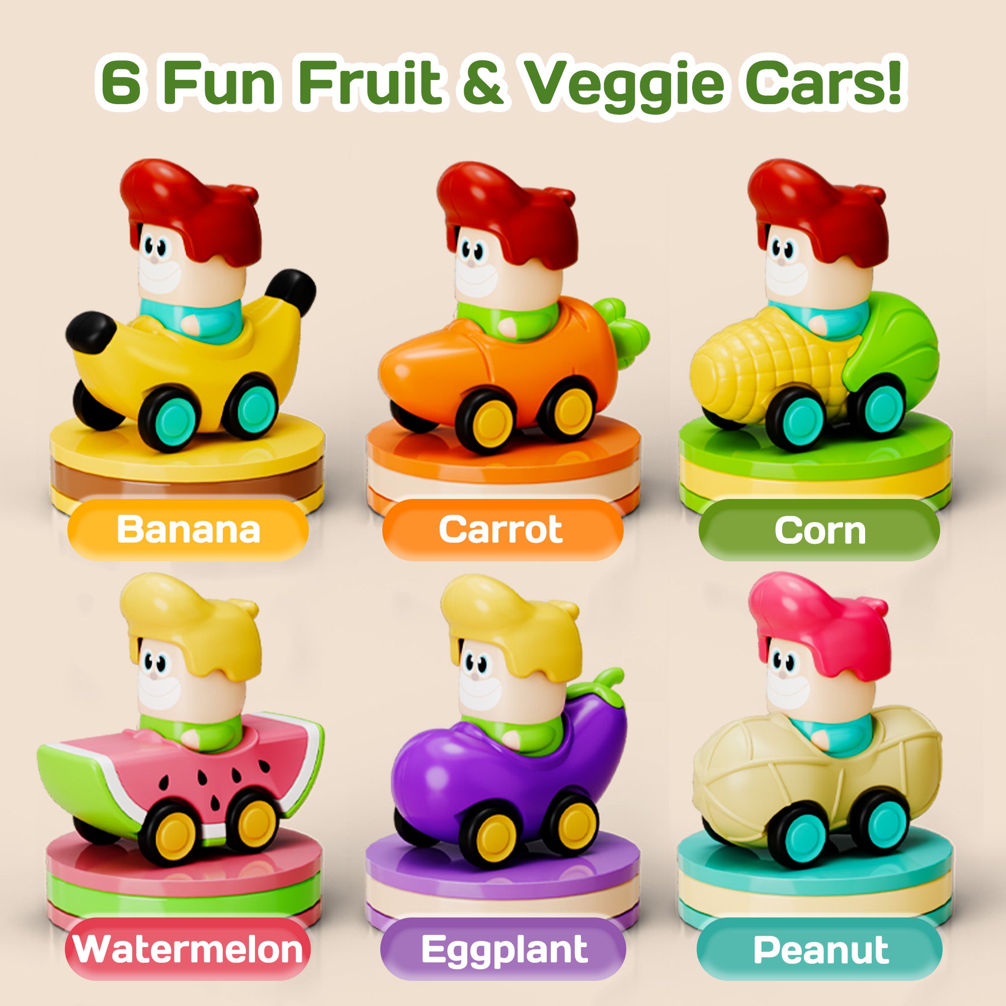 - Adorable Food Friends — Say hi to banana, carrot, corn, watermelon, eggplant & peanut racers! Cute fruit-veggie designs make food/color recognition a playful adventure for toddlers.