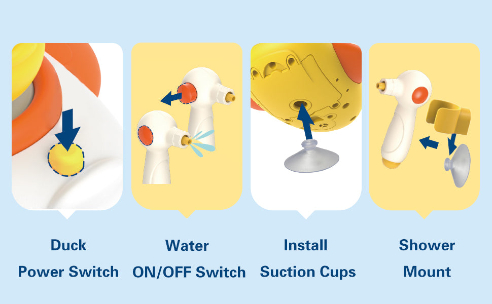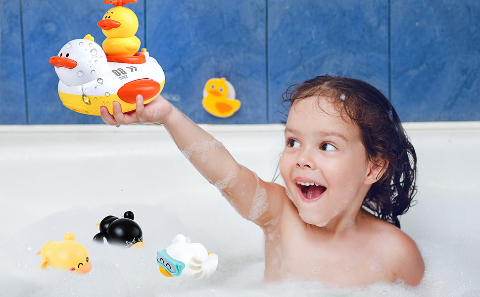 - 『Endless Bath Fun』Our baby bath toys include 1 white duck water foundation, 4 shower head, 3 spraying ducks with different spray methods, 3 wind up floating ducks, 1 soft hose with hold and suction. Different accessory combinations have different fun.