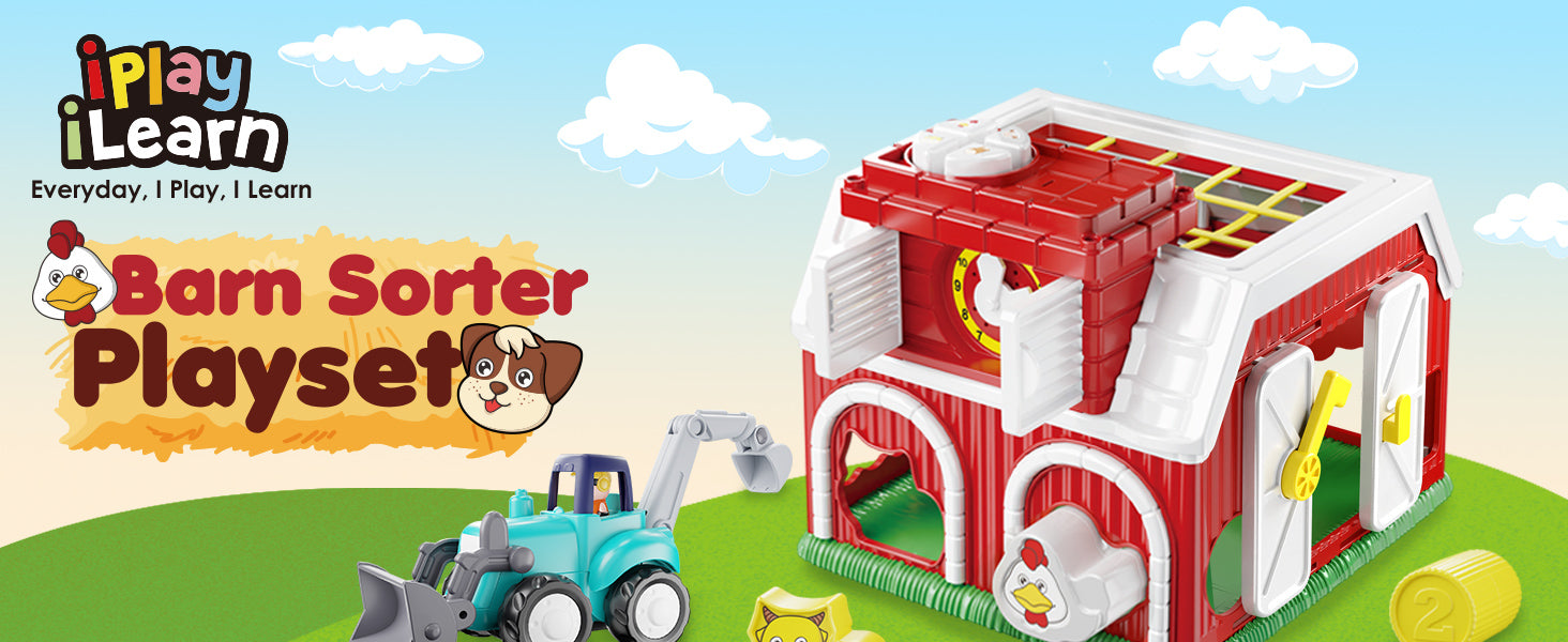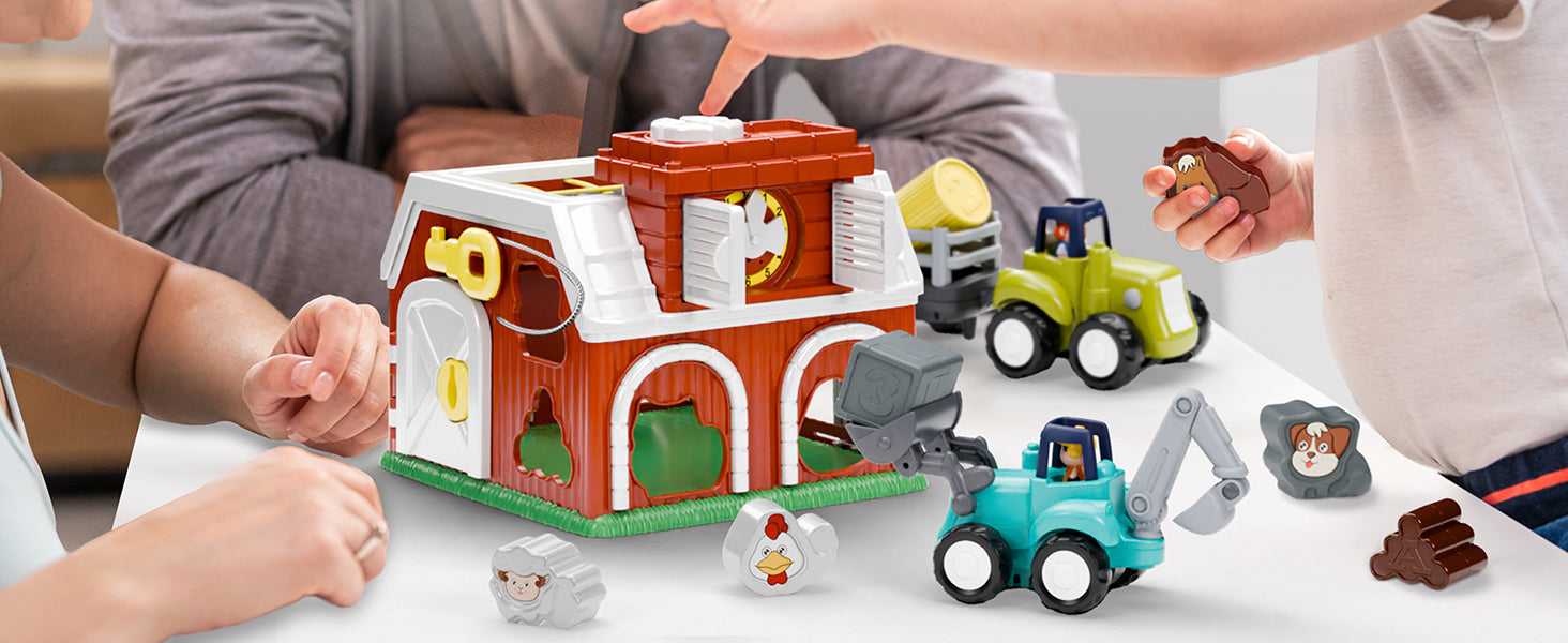 【Farm Animal World】The Farm Animal Barn Playset includes a farm house, tractor, excavator, 5 animal figurines, and shape sorter blocks. Children will engage in imaginative role-play and create their own exciting farm adventures.