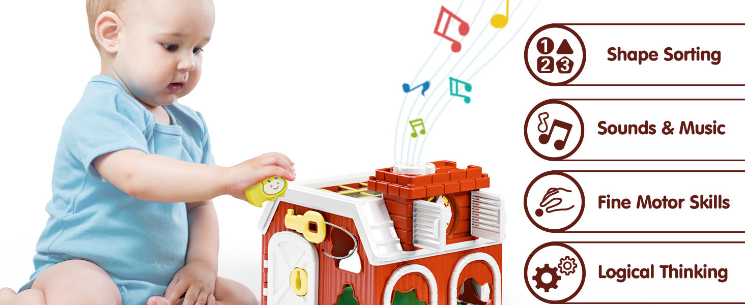 【Musical Shape Sorting Toy】This toy combines music and shape sorting. Toddlers can activate different animal sounds and songs by pressing 4 buttons, while also engaging in play by either pushing the blocks through the elastic bands or fitting them into the corresponding shape holes.