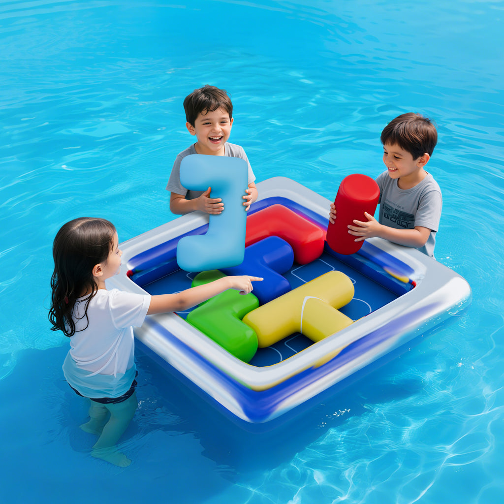Dive into fun with the Pool Puzzle Splash, the interactive floating puzzle that turns your pool into a giant game board! This complete set includes a large square inflatable base and multiple interlocking, geometric pieces. This challenge offers a satisfying mental challenge combined with active water play that provides hours of entertainment for the whole family.